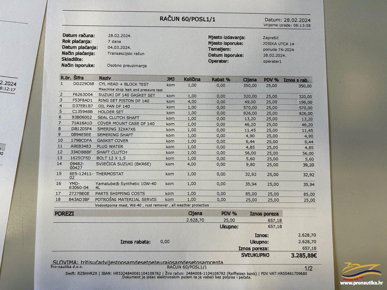 Vrlo uredan i dobro održavan Suzuki DF 140 na kojem je u 02/2024 obavljen velik servis i revizija u trošku od 4.600 € , sve specifikacije radova i računi od servisa dostupni.